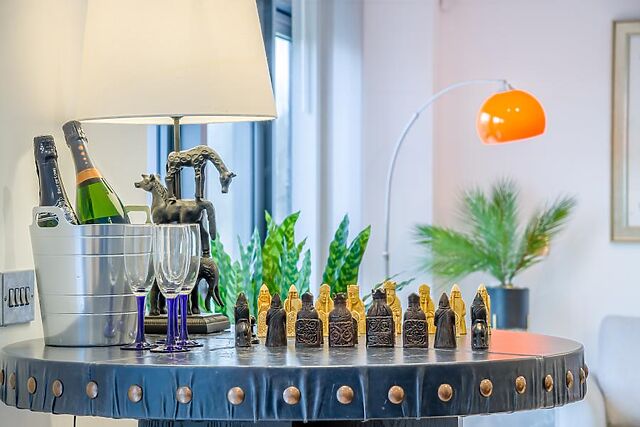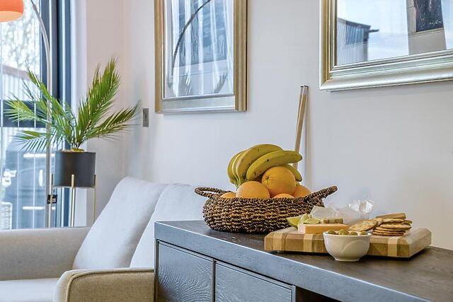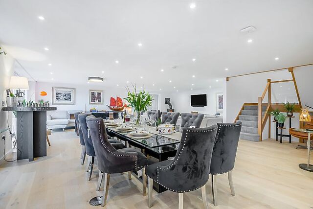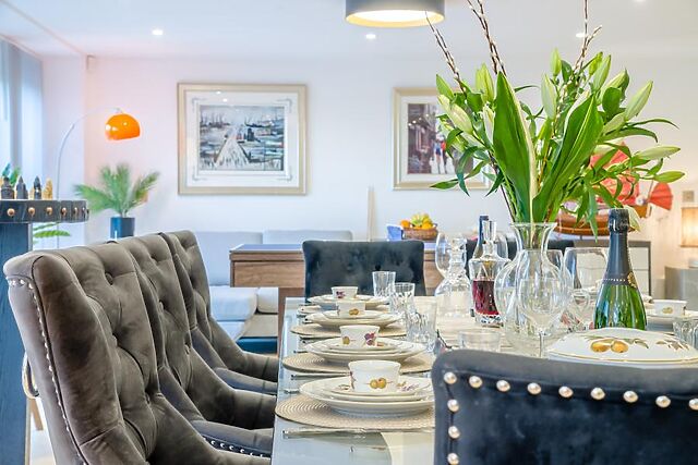 From here, stroll through to the generous, open-plan space, which has been cleverly divided with tasteful, high-quality furnishings. Keen cooks will immediately be drawn to the state-of-the-art kitchen, which has a large island with bar stools and boasts an array of appliances, including a double oven and a Ninja Air Fryer.