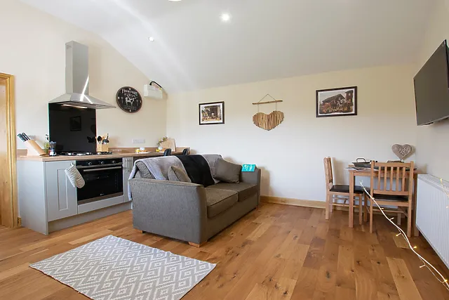 Accommodating two guests, the cottage boasts a cosy double bedroom, a well-appointed bathroom, and an inviting open-plan living space.