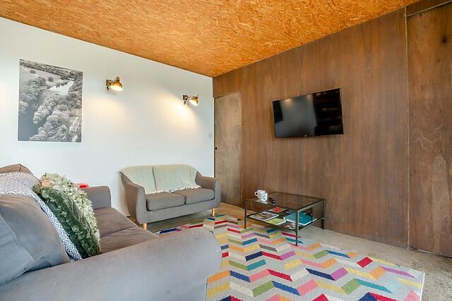 The open-plan living space is the true heart of the lodge, a bright and airy room where huge glass doors let the beautiful outdoors in. After a day of adventure, you can sink into the comfy sofas, get the wood burner going for a cosy atmosphere, and settle down for a film night on the Smart TV.