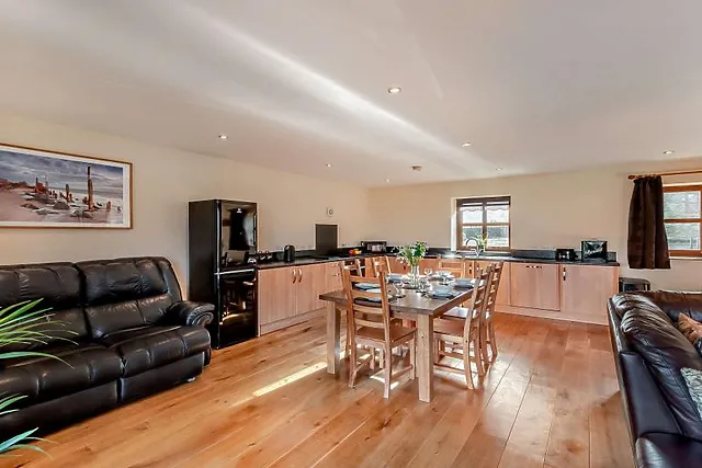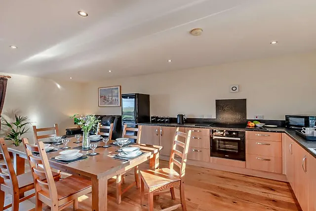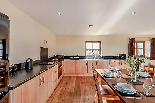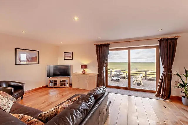 Head into the social heart of the property – the open-plan living space that combines a well-appointed kitchen with a dining and lounge area. This spacious room boasts far-reaching countryside views and is soaked in natural light thanks to the glass patio doors.