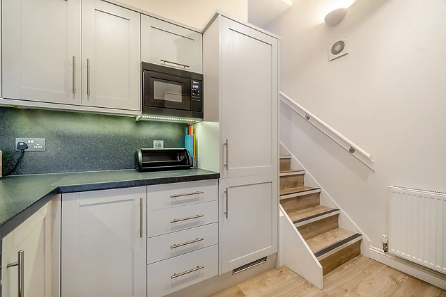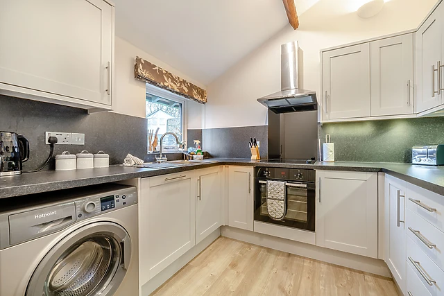 Wander outside to really appreciate the scenic location, and its natural landscape, which creates a rural backdrop to the cottage. A few steps down from the sitting room takes you to a modern kitchen, complete with sleek units and counter tops, as well as a full range of appliances.