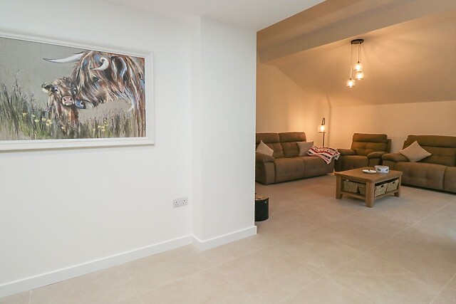Stock up the American fridge/freezer with your favourite refreshments that can be enjoyed in the formal dining area, or put your feet up in the refined living area with the recliners; choose from watching the mounted Smart TV for a homely cinema experience, or throw a log on the woodburning stove, setting the vibe for some quality catchups. Up the stairs, on the spacious landing, the wooden accents and charming artwork keep you connected to your countryside surroundings.