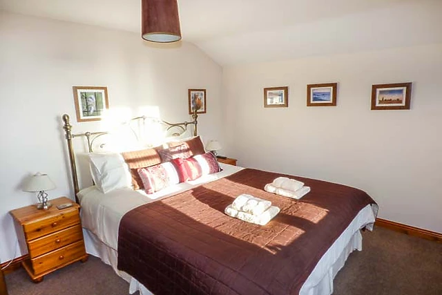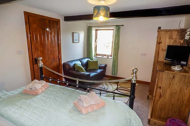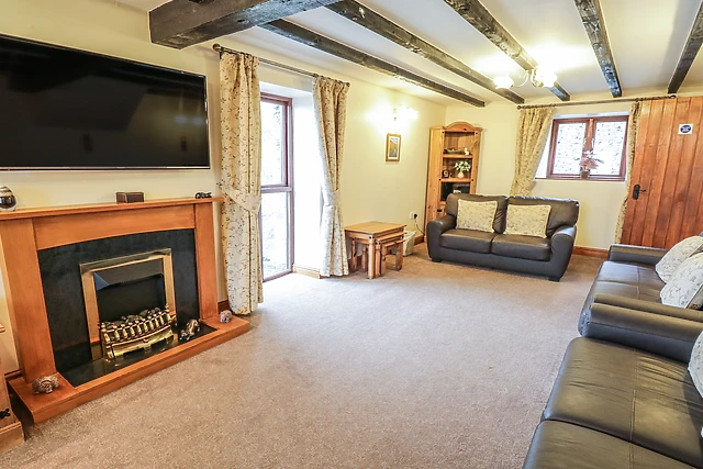 The rest of the rooms are on the lower ground floor with a king-size double with TV and a sofa, a double bedroom as well as two shower rooms with basin and WC and a utility room. From the lower ground floor, the door takes you out to the lovely enclosed back garden with a good-sized patio and furniture, making it a great place to dine alfresco or just sit out and enjoy the countryside.
