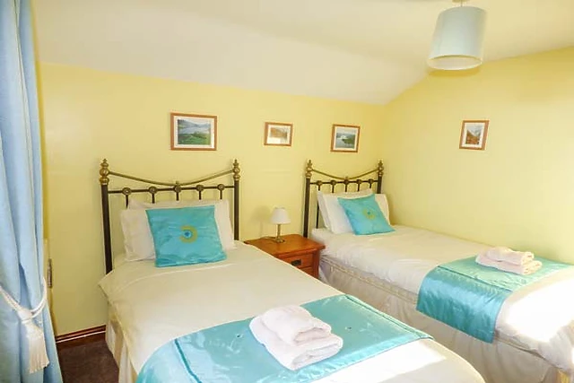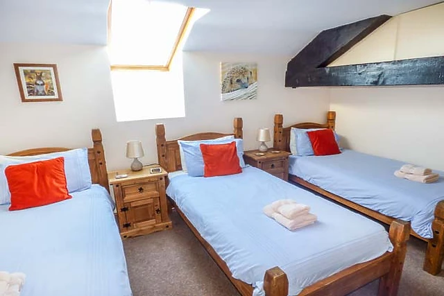 From here leads you into the spacious sitting room with plenty of comfy sofas to relax in, then leading back to the hallway. When going upstairs the stairs split to either side, with a twin (zip/link can be super king-size on request) and a king-size double with TV on one side and a family room with three singles and a family bathroom on the other side.