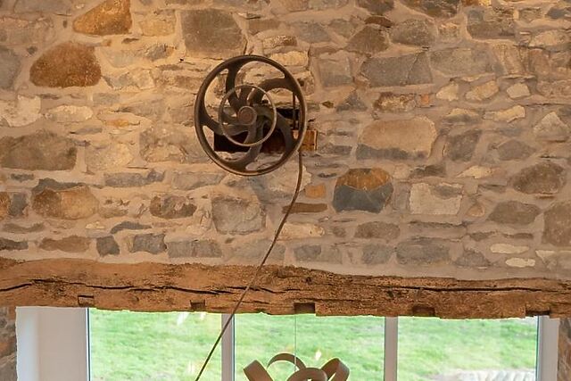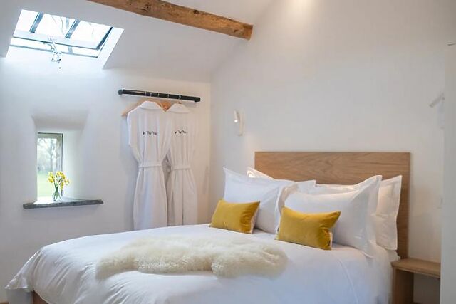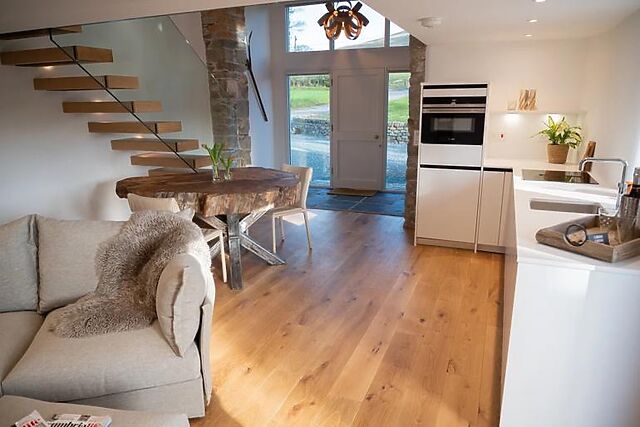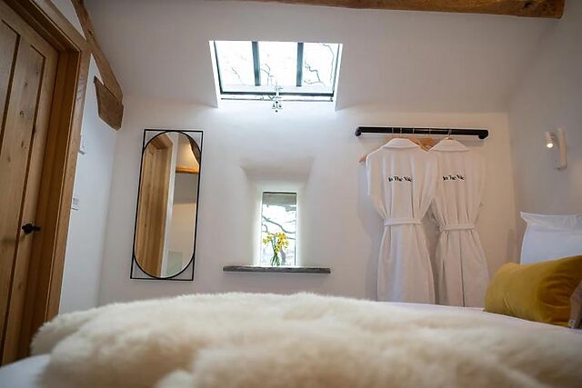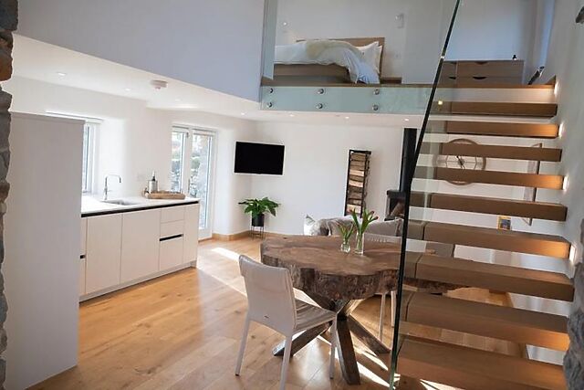 Inside, you'll find an open-plan lounge, kitchen, and dining area, complete with underfloor heating and a cosy suspended wood burner. The kitchen is equipped with top-of-the-range appliances, and the bespoke dining table adds a touch of history to your meals. The floating staircase leads to a mezzanine level with a sumptuous king-size bed and a pristine marble wet room.