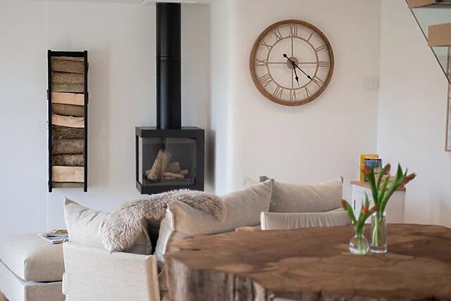 Inside, you'll find an open-plan lounge, kitchen, and dining area, complete with underfloor heating and a cosy suspended wood burner.