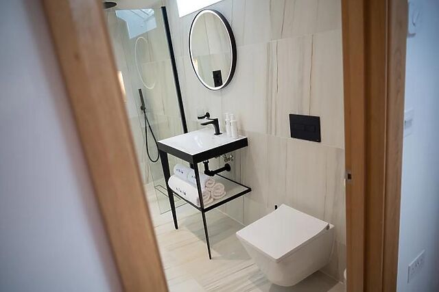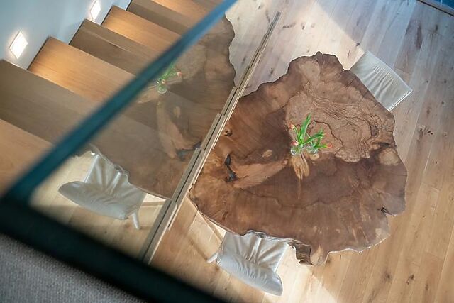The kitchen is equipped with top-of-the-range appliances, and the bespoke dining table adds a touch of history to your meals. The floating staircase leads to a mezzanine level with a sumptuous king-size bed and a pristine marble wet room.