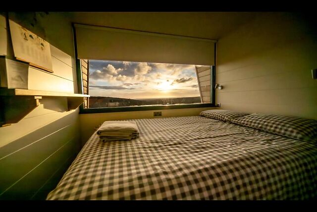 Take four steps up to the double doors, stepping inside to find an open-plan living, cooking, dining and sleeping space that’s delightfully welcoming. The kitchenette may be compact, but it includes a hob, microwave and fridge/freezer – everything you’ll need to whip up hearty breakfasts (using eggs from the smallholding’s rescue hens).