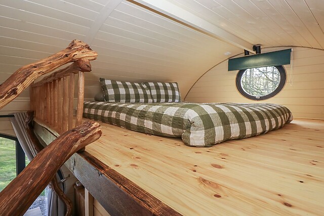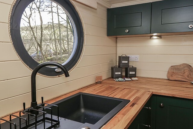 For ultimate convenience, there is a sofa bed, perfect for those who prefer to skip the stairs or simply want to enjoy a movie night in style. Ascend the unique wooden stairs to the mezzanine double bedroom, where a charming circular window adds a touch of magic - reminiscent of a childhood tree-house.