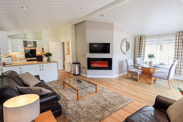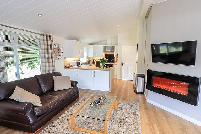 The open-plan living space exudes modern elegance, with wooden flooring and a feature electric fire setting the scene for relaxation.