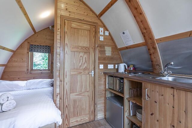 When your day is done, it’s just a few paces to your double bed and shower room. A furnished decking area at the front of the pod extends your living space, while the wow-factor wood-fired hot tub is perfect for a chill-out session.