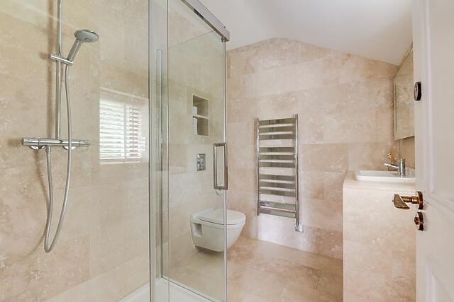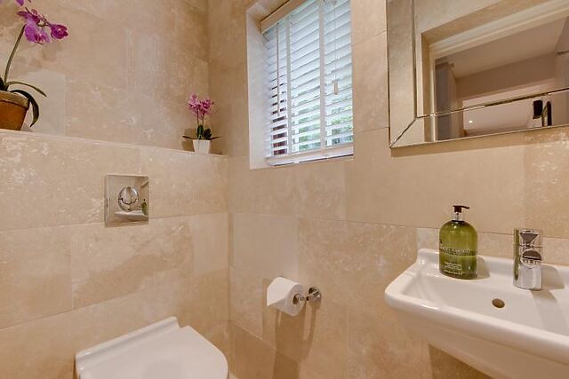 Outside, the expansive 2-acre garden includes a stream, waterfall, summerhouse, and a patio area with a BBQ, perfect for al fresco dining.