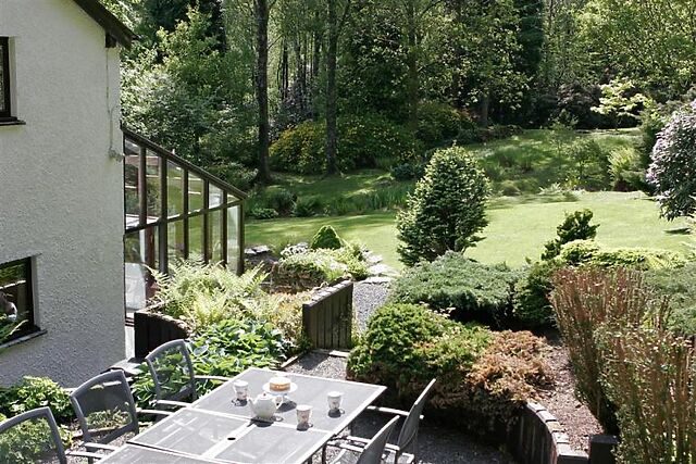 The garden's natural beauty is complemented by the stunning views of Elterwater Common and the Langdale Pikes.