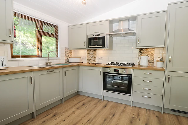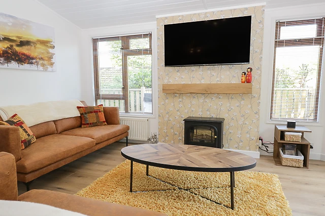 Inside, you'll find a modern open-plan living space with a fully equipped kitchen, dining area, and a cosy sitting area with an electric fire. The lodge also features a convenient washing machine and dishwasher, complemented by broadband/WiFi connectivity to keep you connected during your stay.