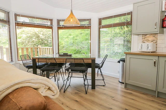 Inside, you'll find a modern open-plan living space with a fully equipped kitchen, dining area, and a cosy sitting area with an electric fire.