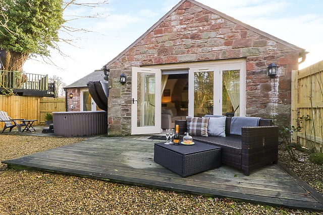 The sitting room leads out onto a decking area with patio furniture, and the bedroom patio doors lead out to your own private hot tub, perfect for a romantic summer’s evening. Netherby is a tiny hamlet near to the England/Scotland border.