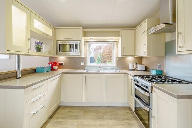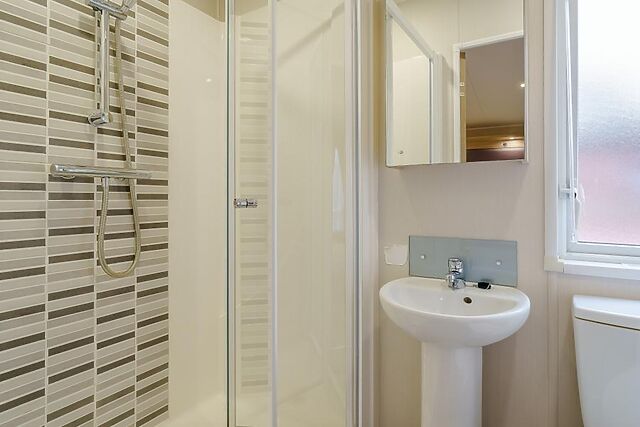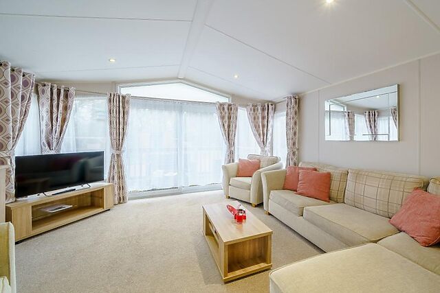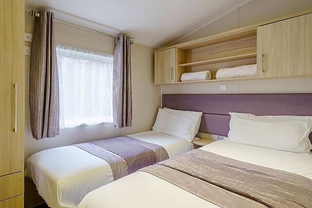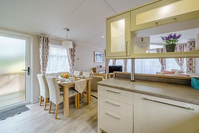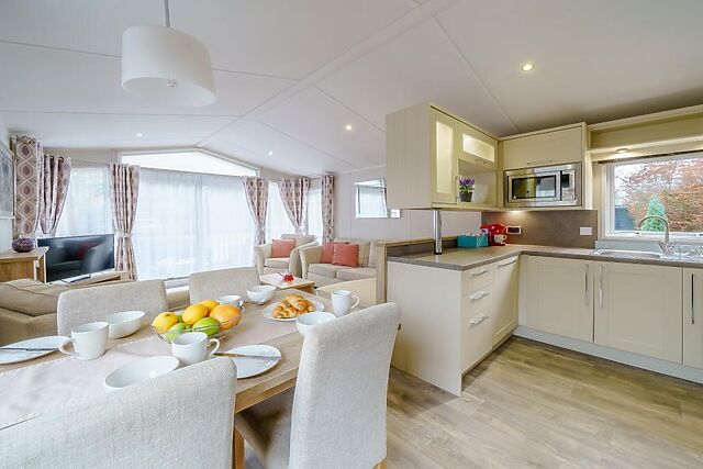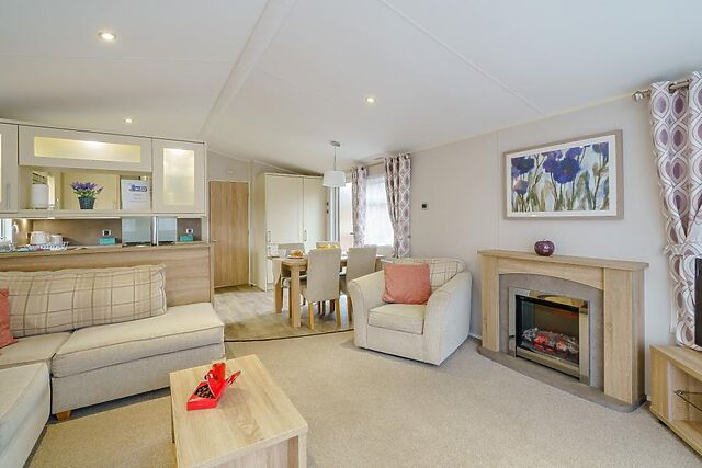 Accommodating up to 4 guests in two elegantly appointed bedrooms, one with a king-size bed and en-suite facilities, and another with twin beds, this lodge is ideal for families or couples. The open-plan living space, complete with a smart TV and a flame effect electric fire, offers a cosy setting for relaxation.