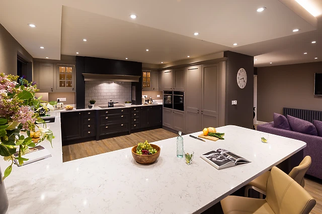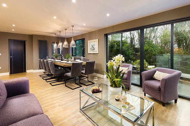 The large dining table is a wonderful sociable space. The contemporary, hi-spec kitchen is thoroughly well equipped and a joy to use.