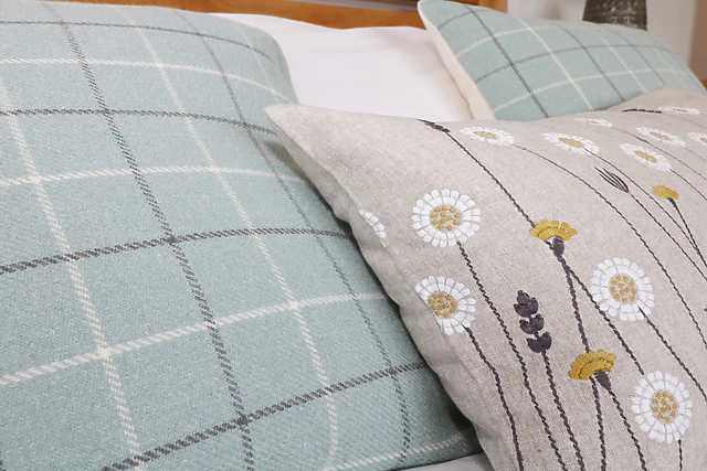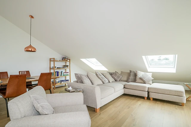 One of the double rooms boasts views of open green fields and patio doors out to the enclosed garden. Upstairs, the open-plan living room makes the most of the views, with dual-aspect windows allowing the natural light to flood the interior.