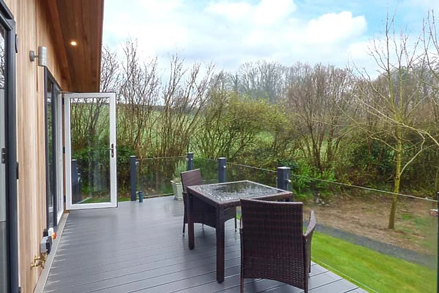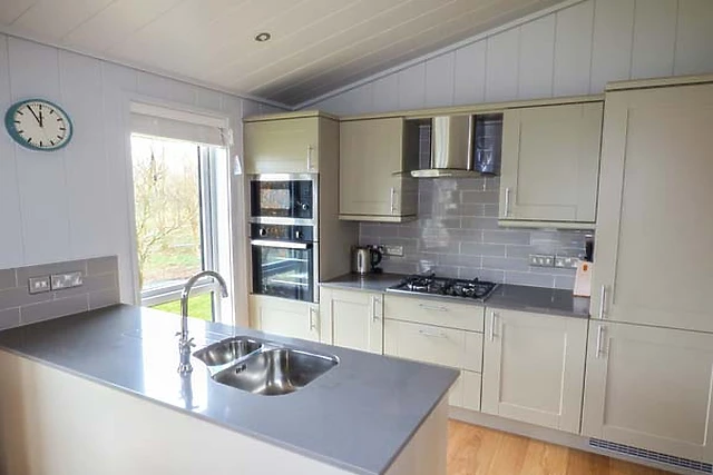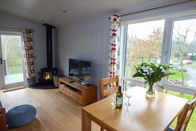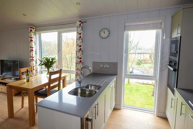 On entering the lodge there is a vestibule with seating area and the washer/dryer which leads into the open plan living space with a large comfortable leather settee and woodburner, perfect to relax in front of on those chillier evenings. When warmer, open the patio doors and step onto the decking perhaps for an alfresco meal or drink and listen to the sound of bird song.