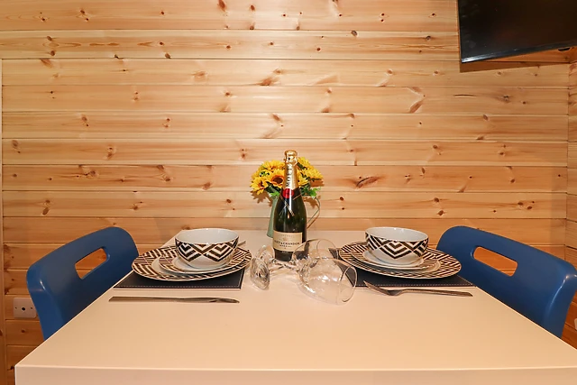 The interior is comprised of an open-plan layout with kitchen, well-appointed for rustling up light meals, along with a dining table where you can enjoy the fruits of your labour. Pour a glass of fizz and retire to the sofa, or step out and enjoy a moment on the patio furniture, stargazing and planning the rest of the holiday.