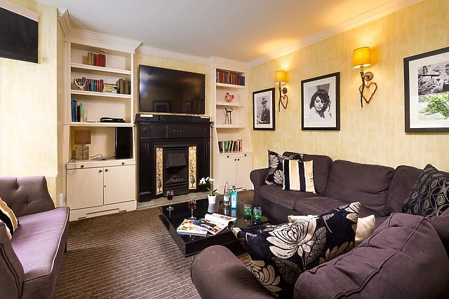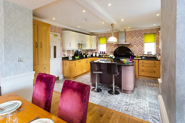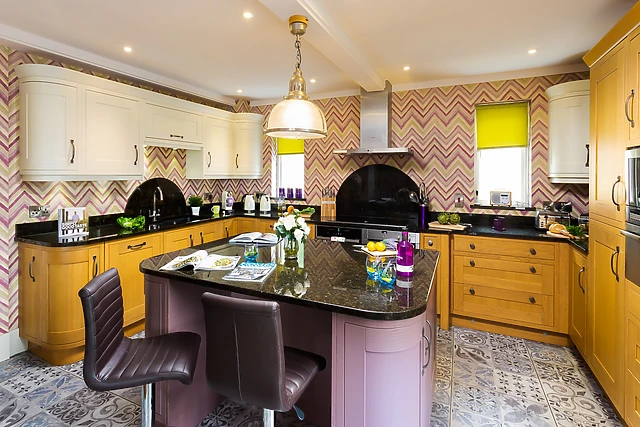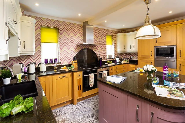 Indulge in the lavish interiors, featuring stylish decor and quirky artwork. The heart of the home boasts a living/dining room with plush velvet sofas and a woodburning stove, perfect for social gatherings. A chic kitchen/diner, complete with modern appliances and a wine fridge, awaits your culinary exploits.