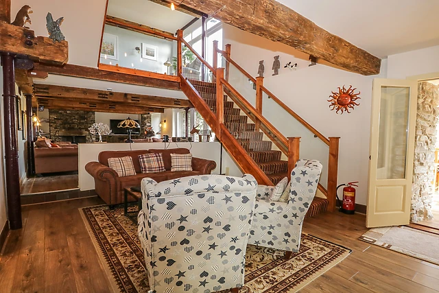 A vestibule welcomes you inside to the comfy lounge, where you will be greeted by a collection of sofas/armchairs, and a woodburning stove to really set the scene. The roomy kitchen is fabulously designed, home to a central island, with a helpful utility across the way, holding those extras you may need.
