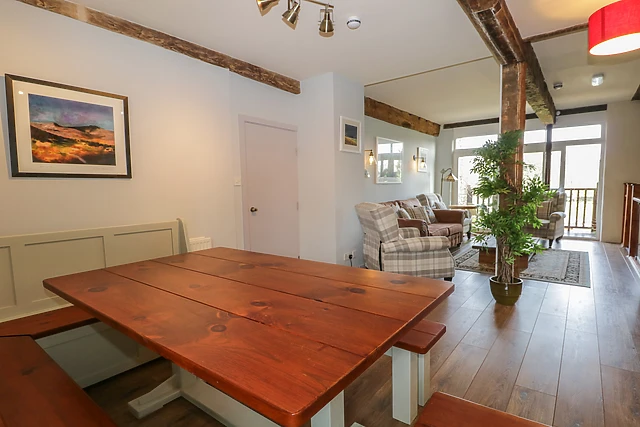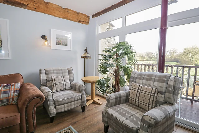 As you reach the first floor, a mezzanine landing awaits, revealing a second living area with comfy seating, a small kitchen, and a farmhouse style dining space. Exposed beams introduce a glimpse of character, views of the fields welcome in the outdoors, and the balcony is your haven for a warm cup of tea.
