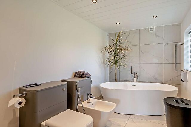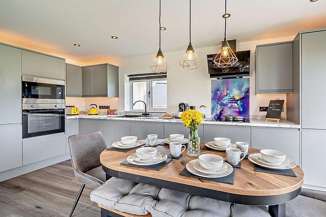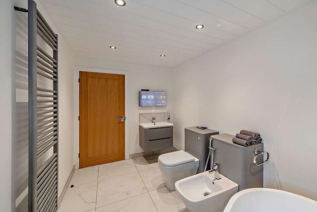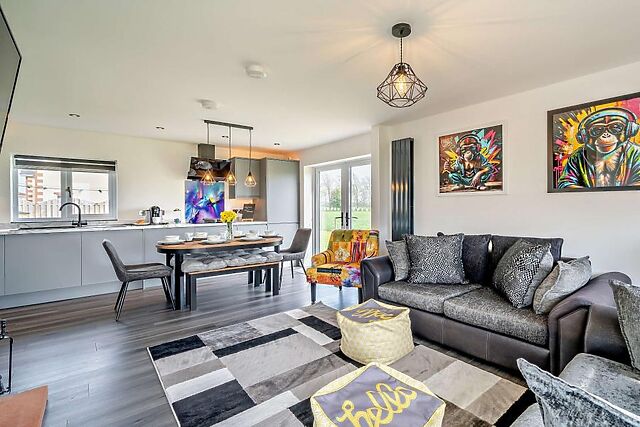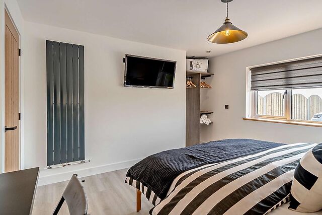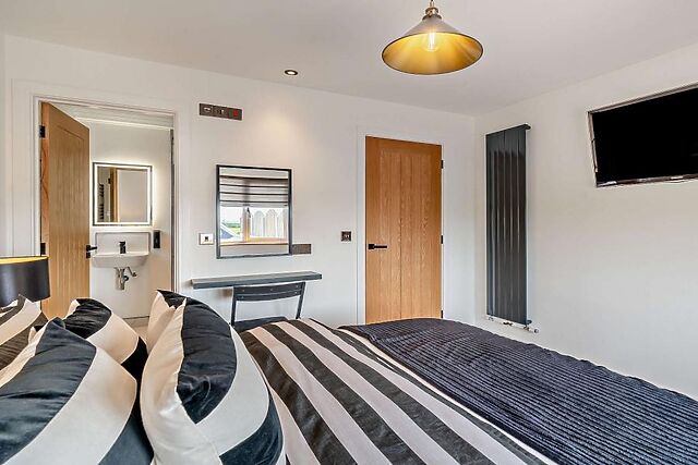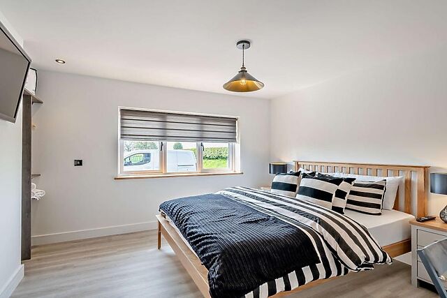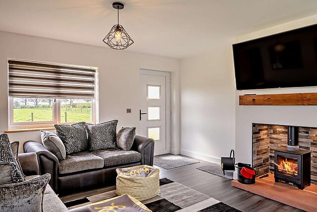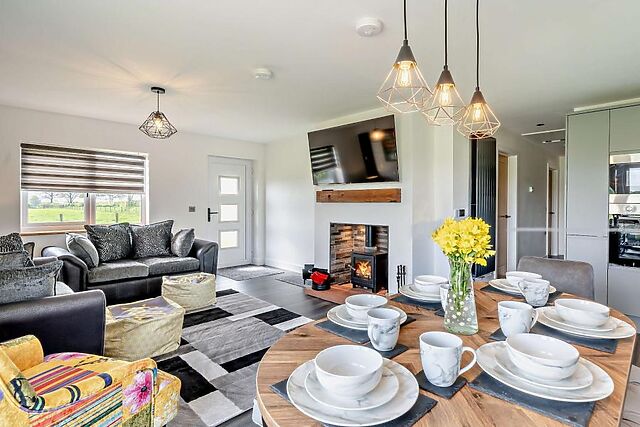 The open-plan lounge/kitchen/diner is a welcoming space filled with comfortable seating options all within a few paw prints of a wood burner and garden views. Three inviting bedrooms - an en-suite king-size bedroom and two double bedrooms - are found across the hallway, while a family bathroom (complete with its own TV) is close by.