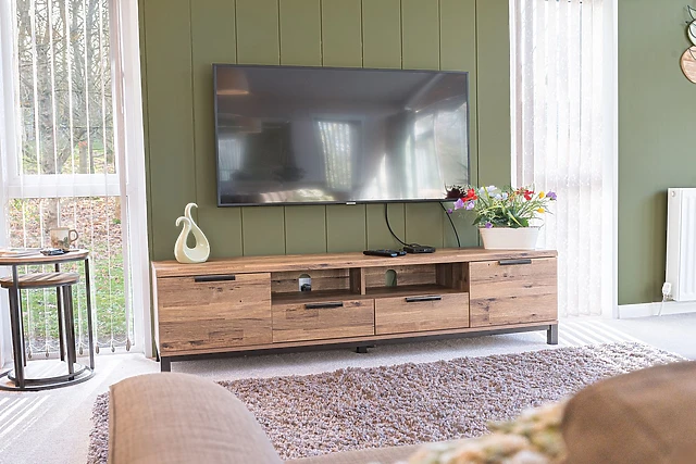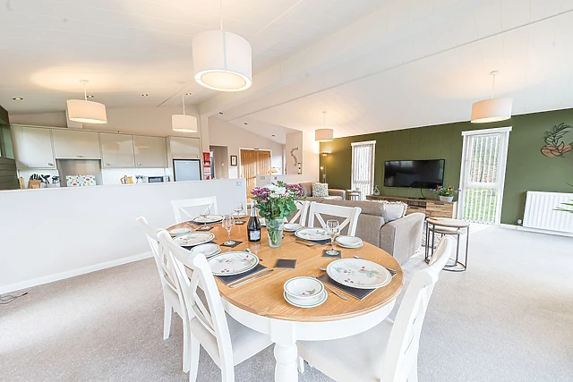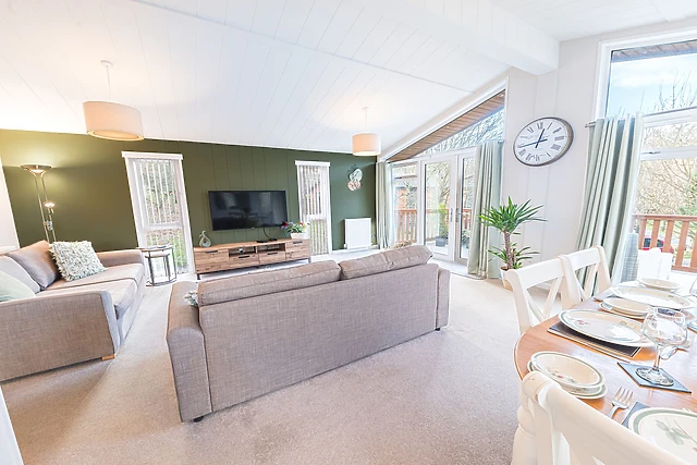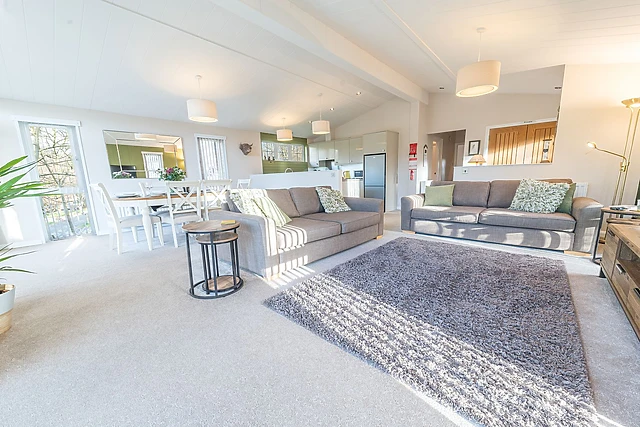 Arrive at the lodge and reach convenient off-road parking, ensuring a hassle-free arrival where you can unload your luggage with ease. Head inside to be welcomed by an open-plan living space that is brimming with natural light, owing to the floor-length windows.