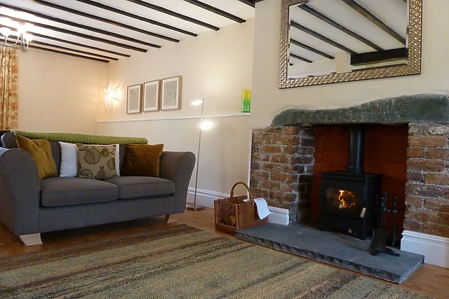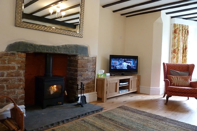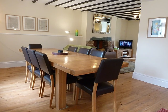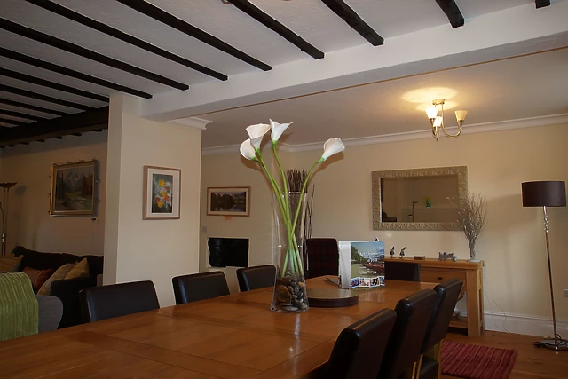 The entrance hall with its wonderful barley twist staircase leads into the open plan living and dining room with its timber floor and exposed character beams. There's a feature brick fireplace with a large wood burning stove that's ideal for those cooler evenings and plenty of squashy sofas for relaxing.