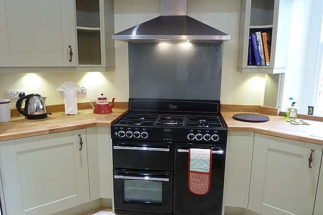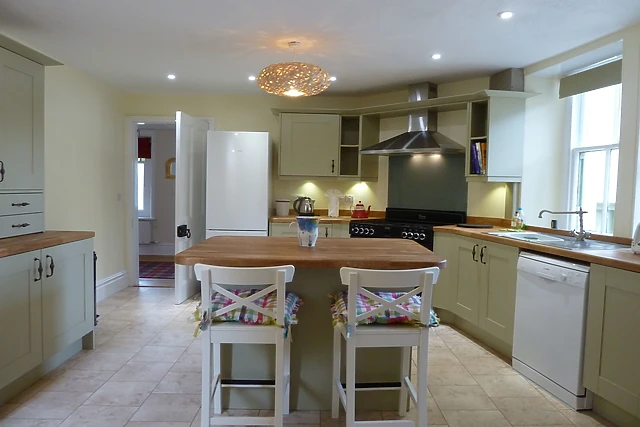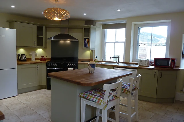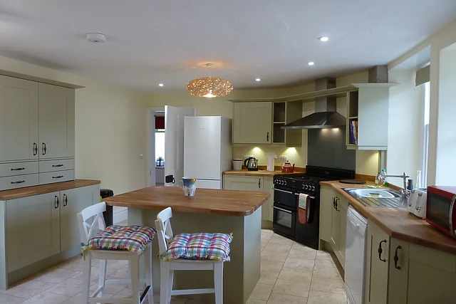 There's also a TV and DVD, WiFi and a selection of information on the local area. The spacious kitchen is fully equipped with a range cooker and central island unit, and there's another cosy sitting area with its own wood-burner.