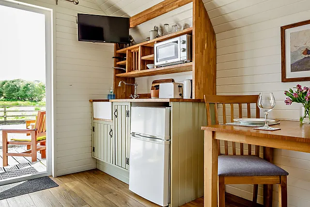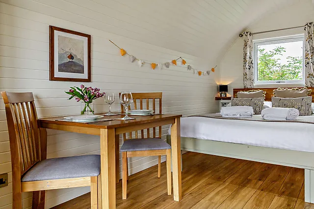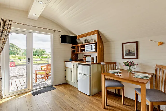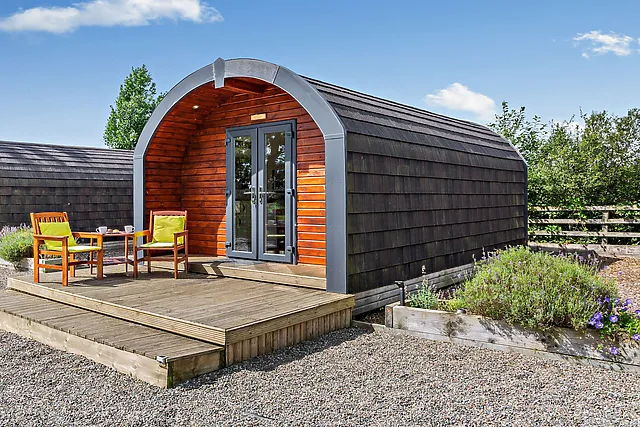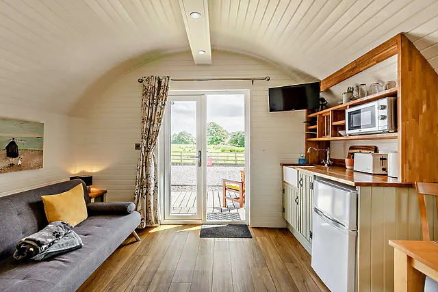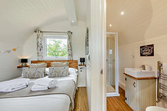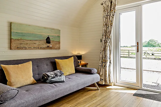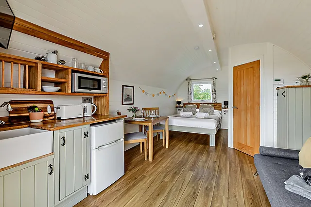 The accommodation boasts a comfortable double bed located in the sleeping area to the rear of the pod, ensuring a restful night's sleep for guests.