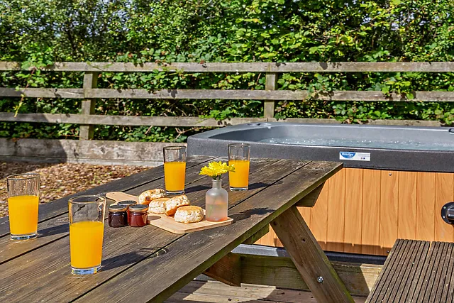 Yes, the accommodation features a private hot tub on the decked area, offering a serene spot to relax and enjoy the countryside views. An additional charge applies for the use of the hot tub, which is payable to the owner upon arrival.