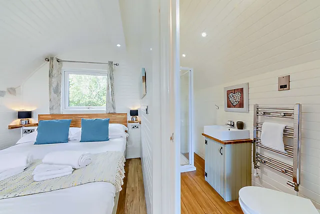 The lodge pod includes a double bed, shower room, kitchenette with essential appliances, electric heating, bed linen, towels, Wi-Fi, and a TV. It is part of a complex of properties with an enclosed garden and patio.