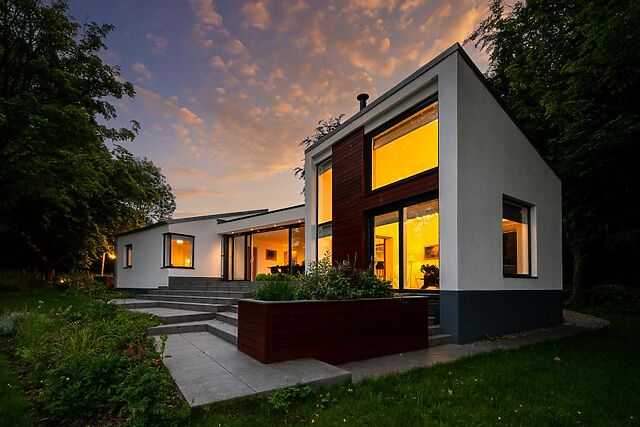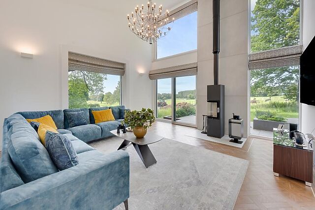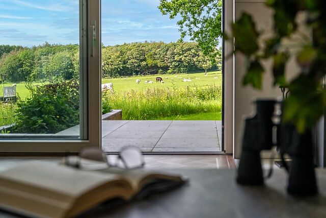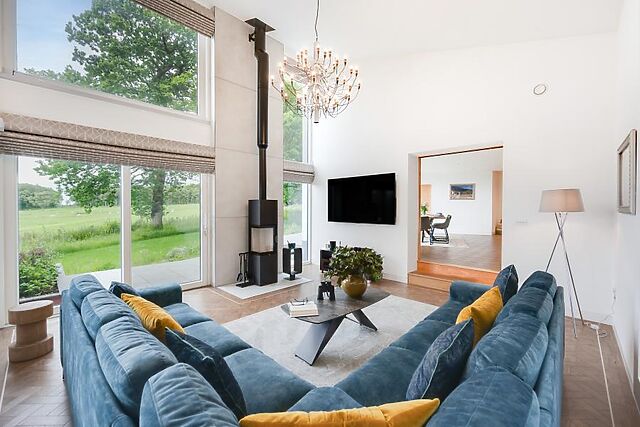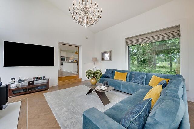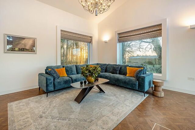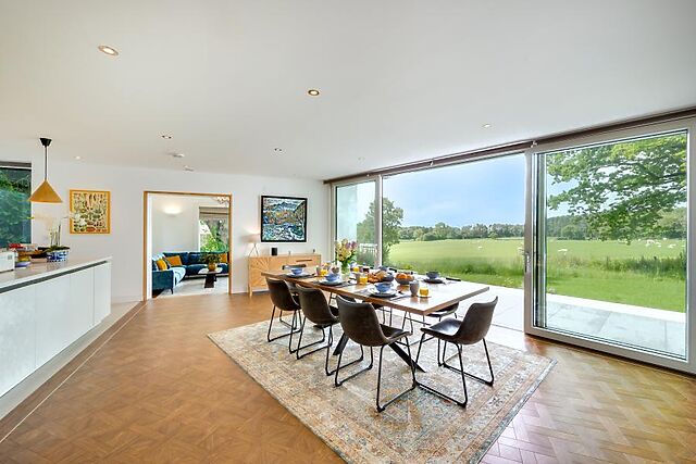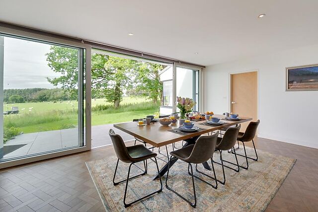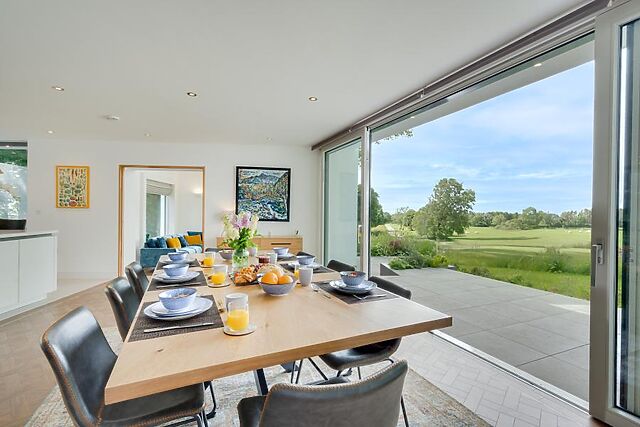 The striking property is decorated in a contemporary style, with sleek furniture, a neutral colour scheme and a fabulous collection of statement accessories and artwork. The holiday home is bathed in natural light, thanks to vast picture windows overlooking the surrounding countryside.