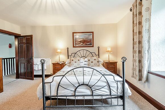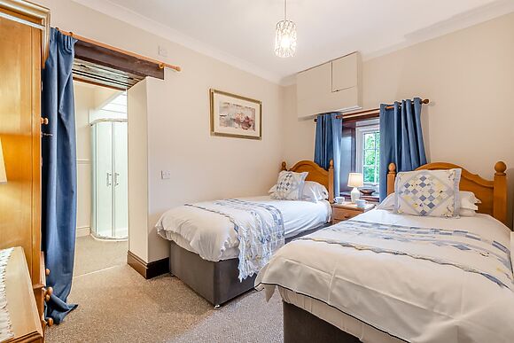Four bedrooms sleep 9: a ground-floor twin with en-suite shower; a first-floor four-poster double (4ft 6in) with en-suite; a first-floor double (4ft 6in); and a first-floor twin. A family bathroom with bath and shower over serves the upper floor.
