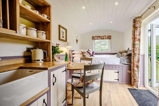 The accommodation features a cosy open-plan layout with a raised double bed, a dining area, Smart TV, and a well-equipped kitchen.