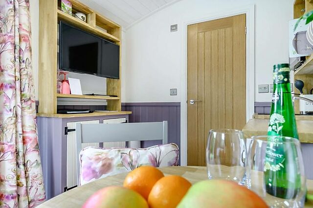 The accommodation features a cosy open-plan layout with a raised double bed, a dining area, Smart TV, and a well-equipped kitchen. The bathroom includes a shower and WC, ensuring all your needs are met within this charming space.