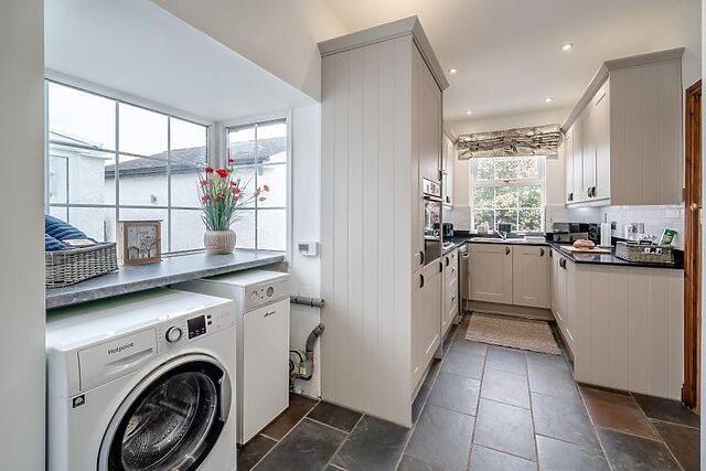 Enter via the side door, up one step, and you’ll find yourself in a smart kitchen. Head to the open-plan living/dining area and take a moment to admire its traditional exposed beams, decorated bookshelf, and cosy wood burner.