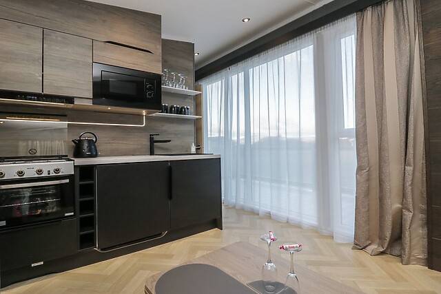 The open kitchen and sitting room is sleek and stylish, there is a gas cooker and oven to whisk up a romantic meal, with music playing from the Smart TV to set the mood. The en-suite is contemporary with a shower and useful Jack-and-Jill access.