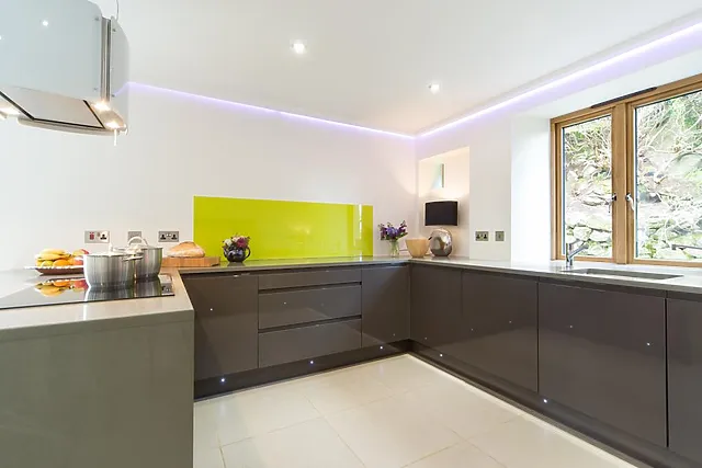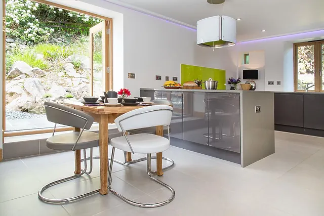 Sink into the cosy seating to watch TV on the 3D UHD TV with a sound bar or to listen to the Kawai RX3 professional grand piano if one of your group is musical, or gather around the dining table for a meal with a view. A double-sided wood burner links the living room with the elegant and beautifully equipped kitchen.