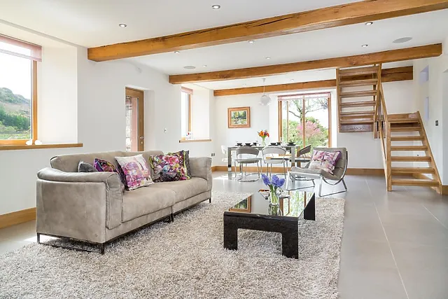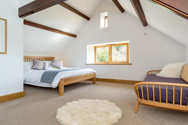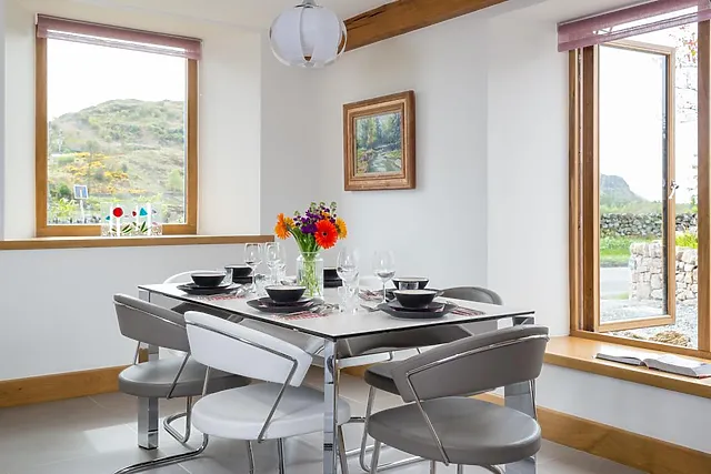 The traditional look of this cottage belies its contemporary interiors, though you’ll get a taste of its stylish decor when you approach the substantial solid oak doorway with its stained glass panel. The open-plan lounge/diner is light, airy and relaxing with panoramic country views from five windows, as well as a beautiful stained glass window.