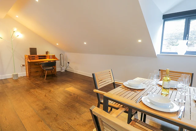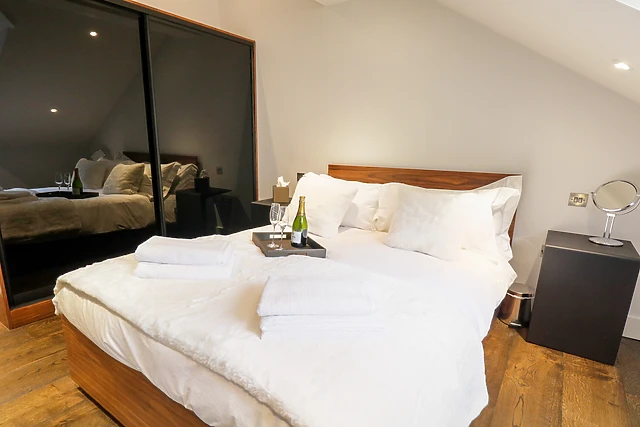 The apartment sleeps two guests in a tastefully decorated double bedroom with an en-suite shower room. The open-plan living space boasts a contemporary kitchen and a cosy area for dining and unwinding. Step outside onto your private terrace and slip into the hot tub, where you can soak up breathtaking views of Lake Windermere and the surrounding fells.
