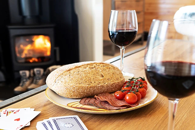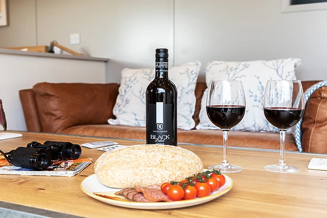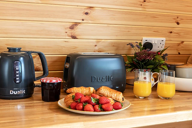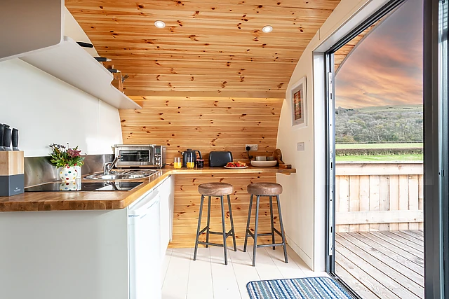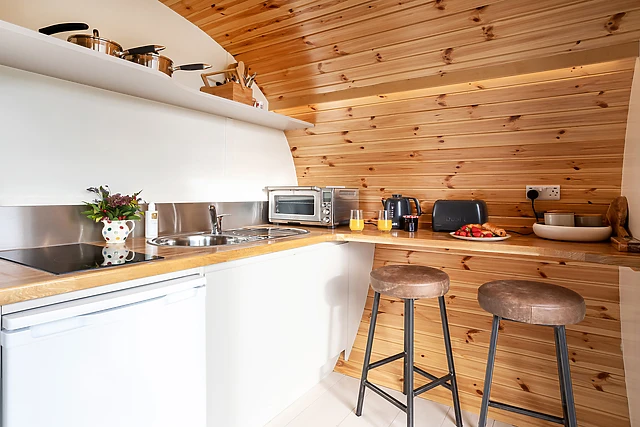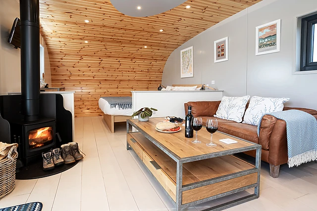 The pod's central heating and woodburning stove ensure a warm and inviting atmosphere, regardless of the weather outside.