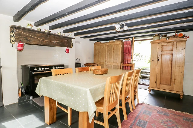 The kitchen is a true farmhouse kitchen with beams, range cooker, Belfast sink, slate floor and dining table with chairs. Upstairs, one of the bedrooms has a traditional metal and brass-style bed and all have far-reaching views of the beautiful surrounding countryside.