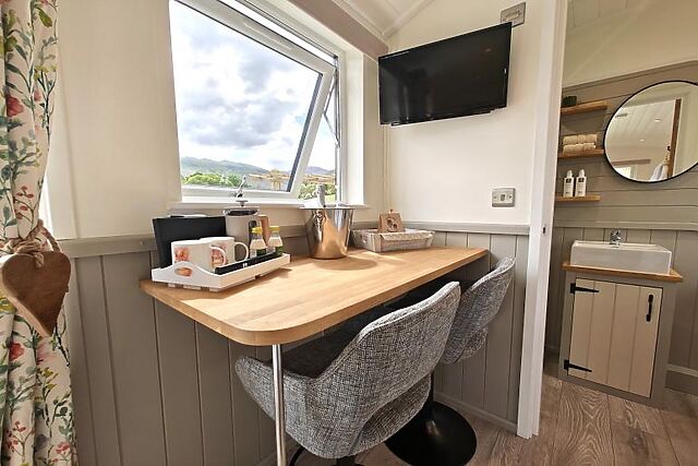 Prepare light meals and snacks in the kitchen area with its wooden work surfaces and Belfast sink. Enjoy romantic meals together at the breakfast bar while gazing out over the verdant fells.