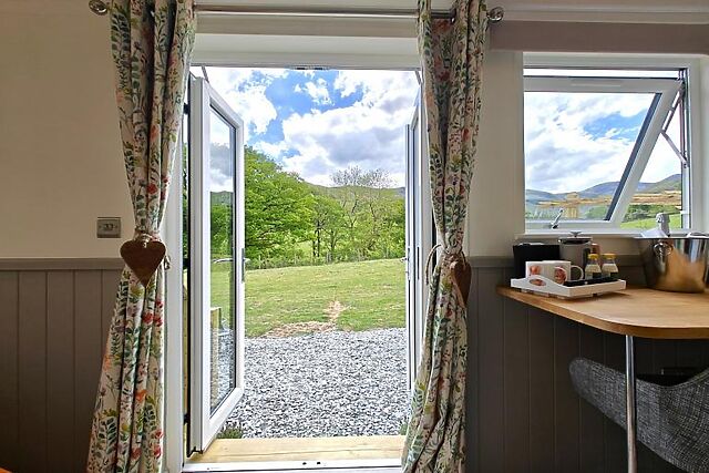Climb three steps up to make your way in via the French doors. Find yourselves in an open-plan lounge/kitchen/diner/bedroom that has been creatively designed to encompass everything you are likely to need during your stay.