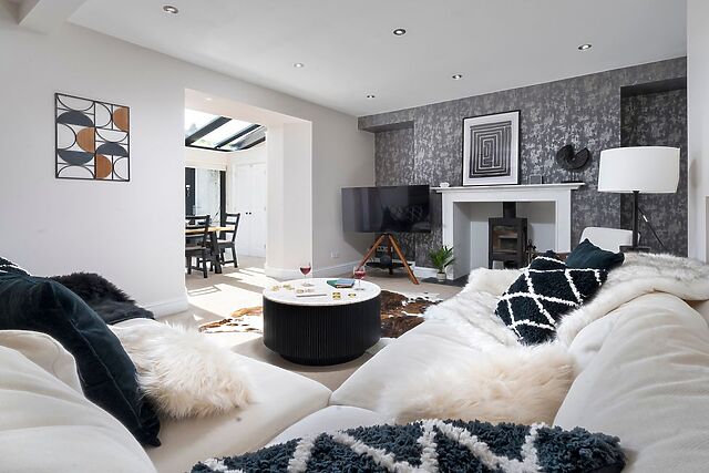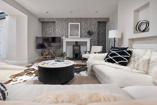 Head down to the lower-ground-floor, where a beautiful open-plan living space awaits, with generous sofas, a crackling woodburning stove, and large Smart TV for those movie nights with loved ones, as well as a huge dining table to seat all guests, and a contemporary kitchen for rustling up tasty dishes. On this floor you will also find a well-appointed bathroom, for indulgent soaks away from it all.