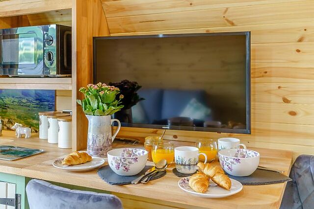 One of the highlights of Striding Edge is the private hot tub on the decking area, where you can relax and take in the stunning views. The pod also offers private parking for one car, and dogs are welcome, although they are not allowed on the beds.